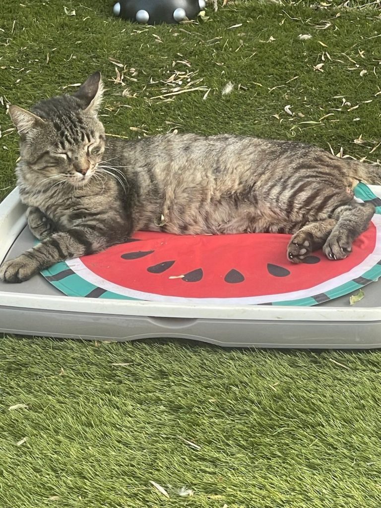 Catsby hoy ha decidido que si se tenía que disfrazar, mejor así de sandía, ¡¡a ver si te van a comer!!