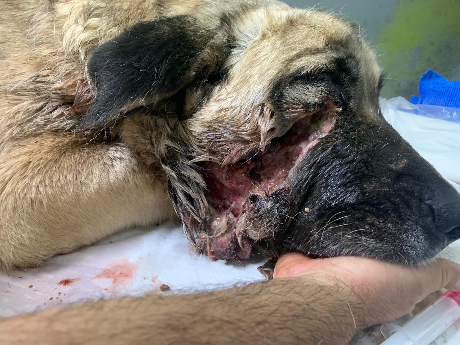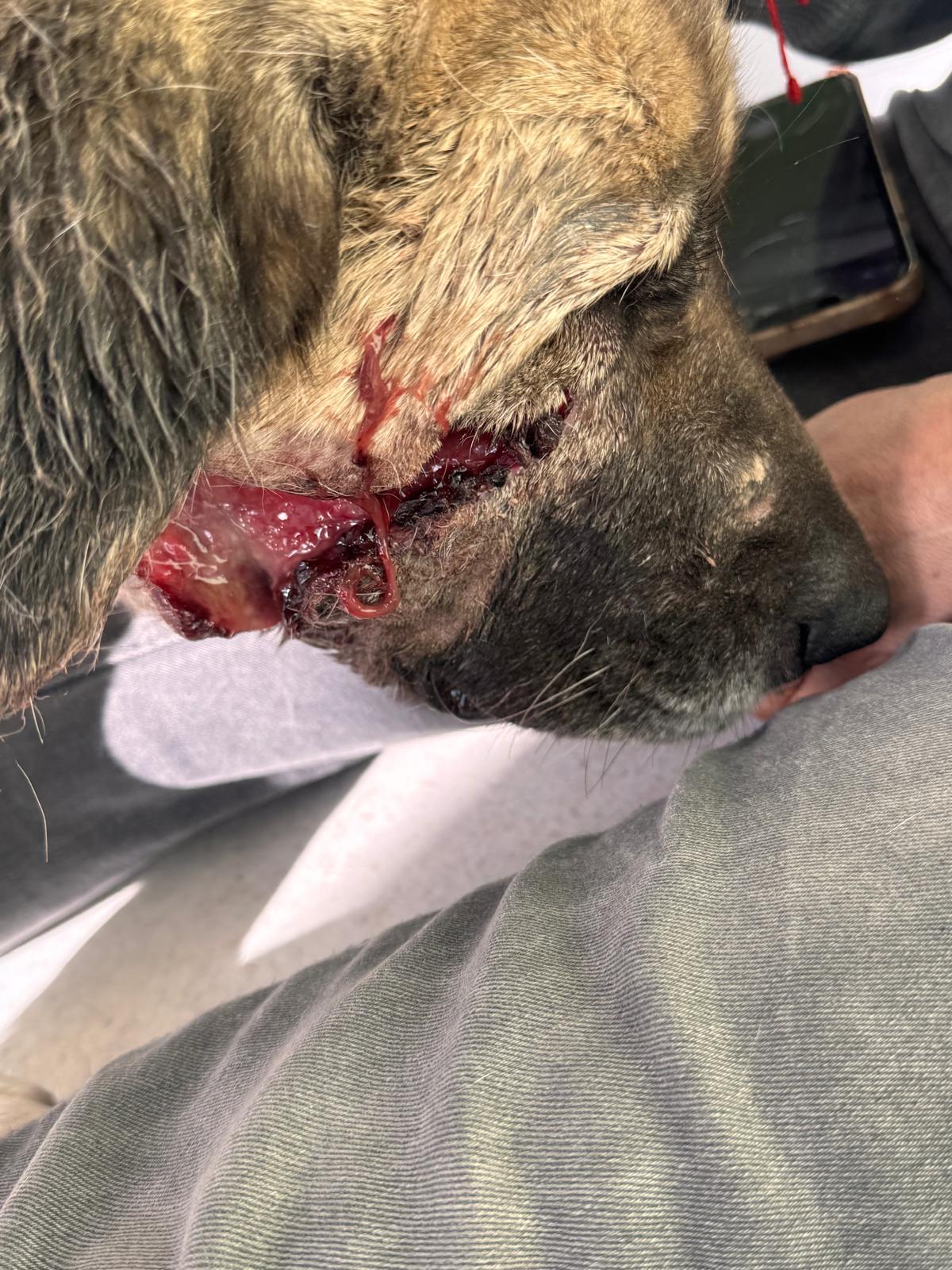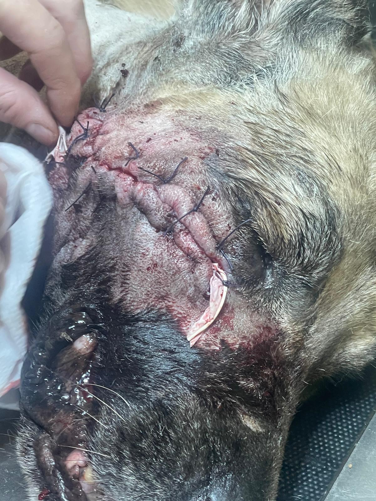 Al día siguiente fue llevada al hospital veterinario donde le realizaron una intervención quirúrgica para valoración del daño, limpieza exhaustiva de la herida y cierre parcial de la misma dejando drenaje. La infección de la herida era tan grave que no pudieron hacer más. Por el momento, LUZ está recibiendo tratamiento antibiótico intensivo, antiinflamatorios y analgésicos para control de la infección y, según evolucione, se planteará realizar otra cirugía para reparación de fractura mandibular.