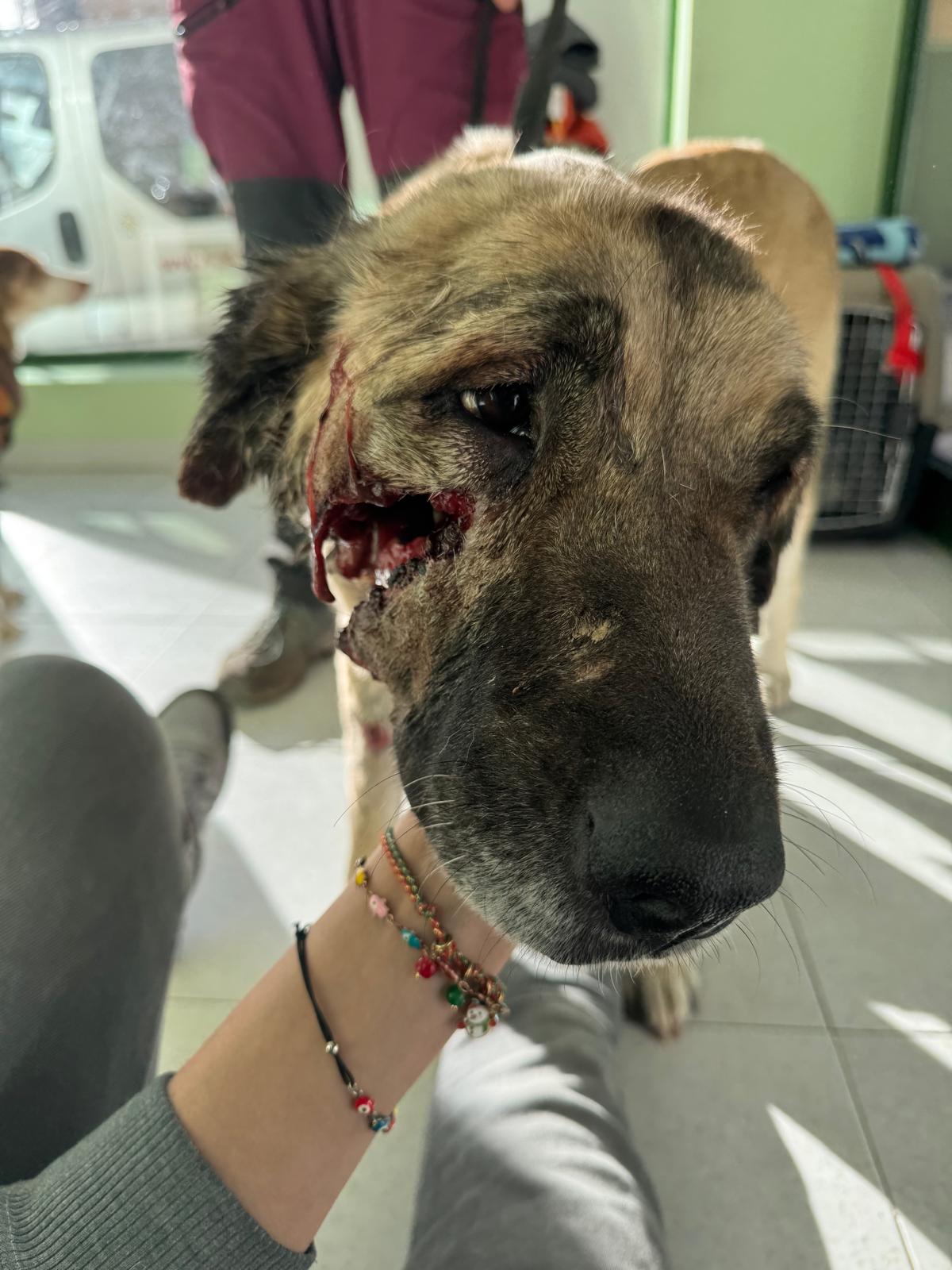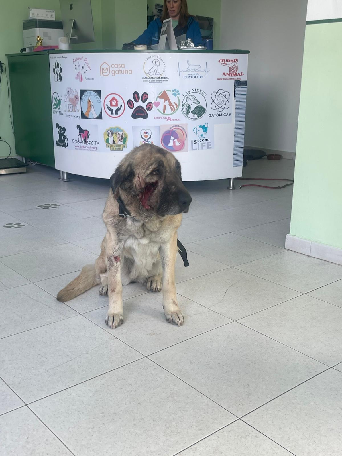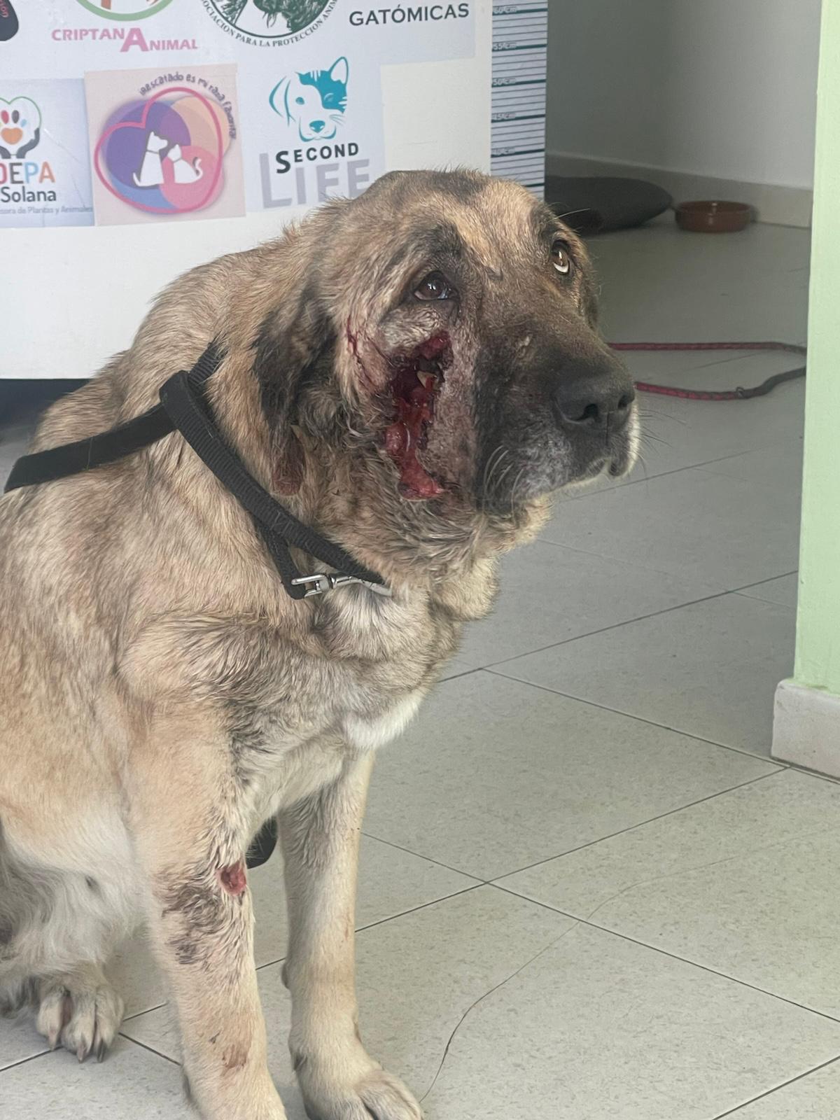 Con la mandíbula rota y la cara destrozada estuvo varios días sin rumbo, siendo vista por mucha gente que decidió “mirar a otro lado” sin ayudarla ni auxiliarla; hasta que una buena persona la cogió y la llevó a un centro veterinario.