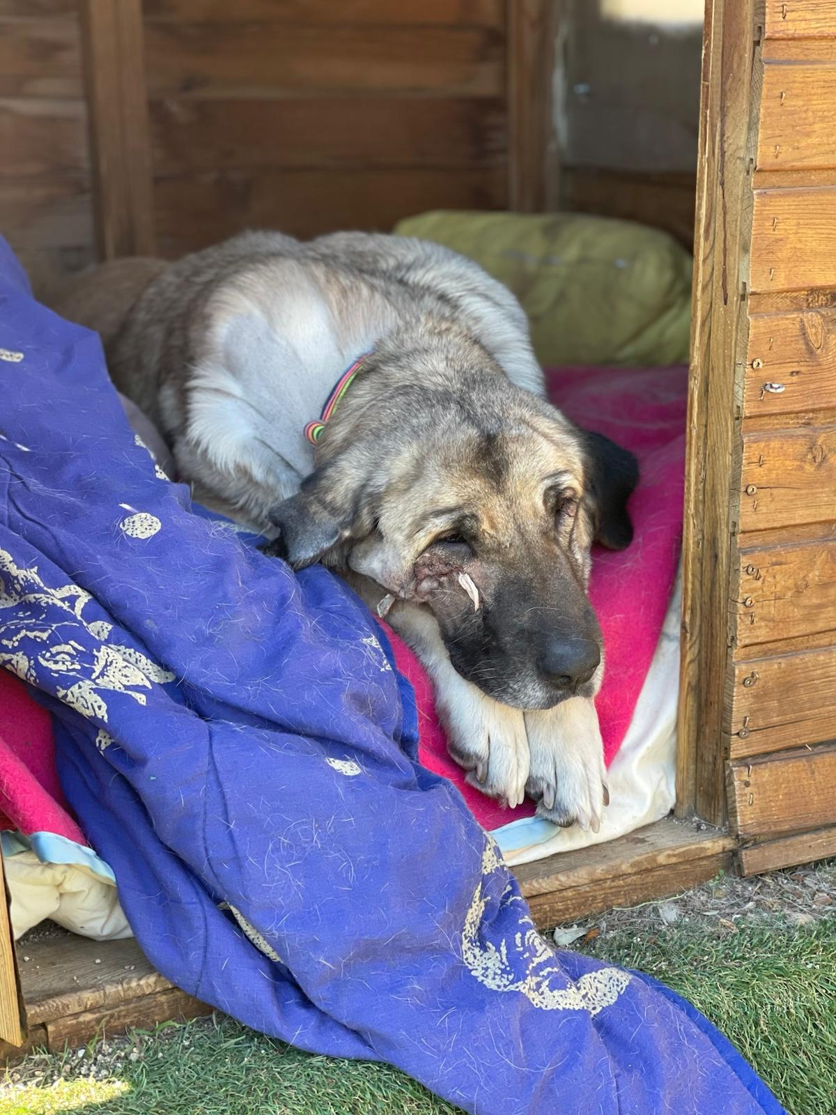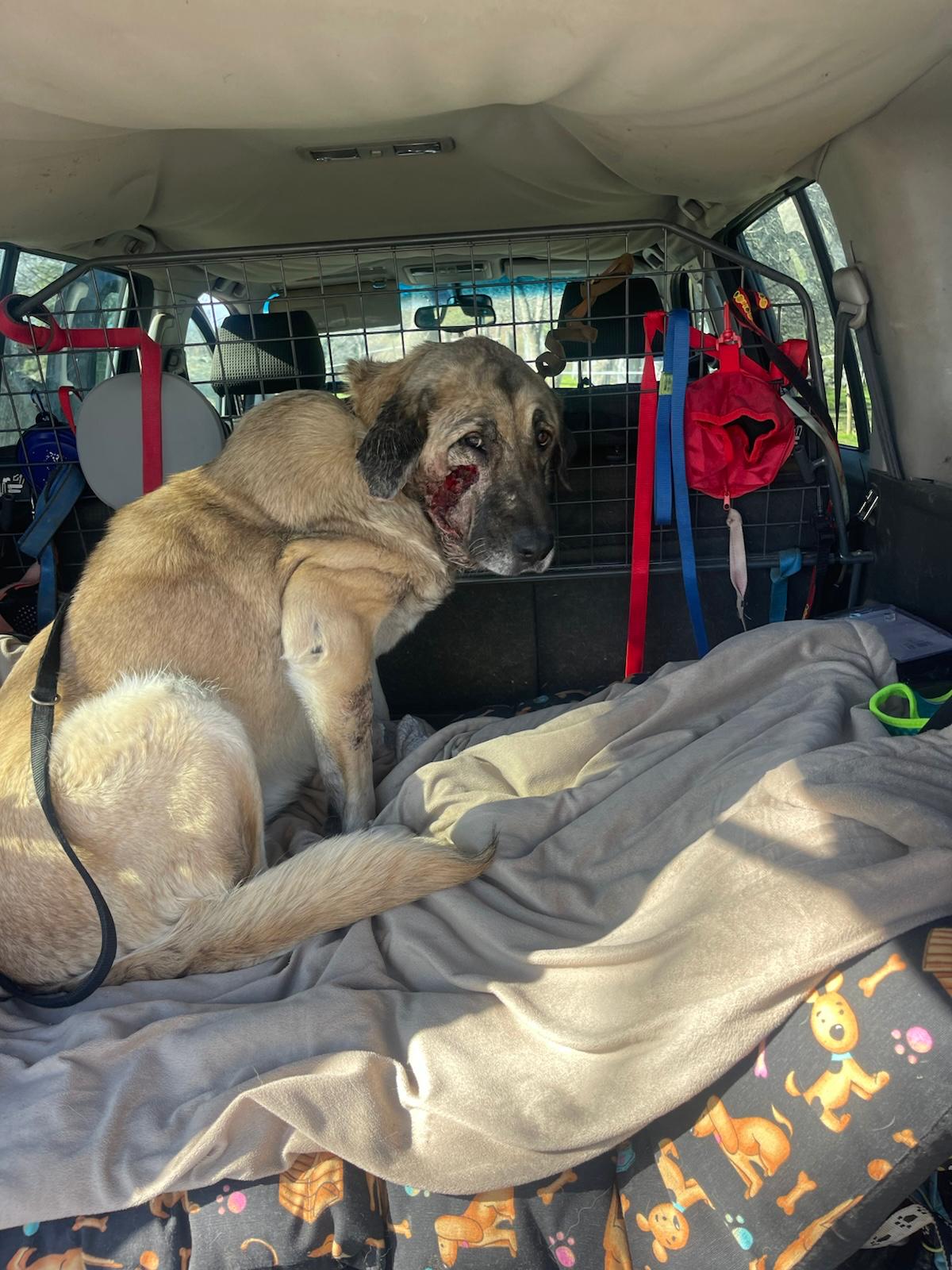 En cuanto llegó, le preparamos un lugar especial, calentito y tranquilo. Le limpiamos un poco las heridas y descubrimos que también le habían disparado en una pierna, donde tenía una infección grave. Deciros que mientras la curábamos no paraba de darnos lametones y besitos (como dándonos las gracias). Es un ser de luz lleno de bondad.