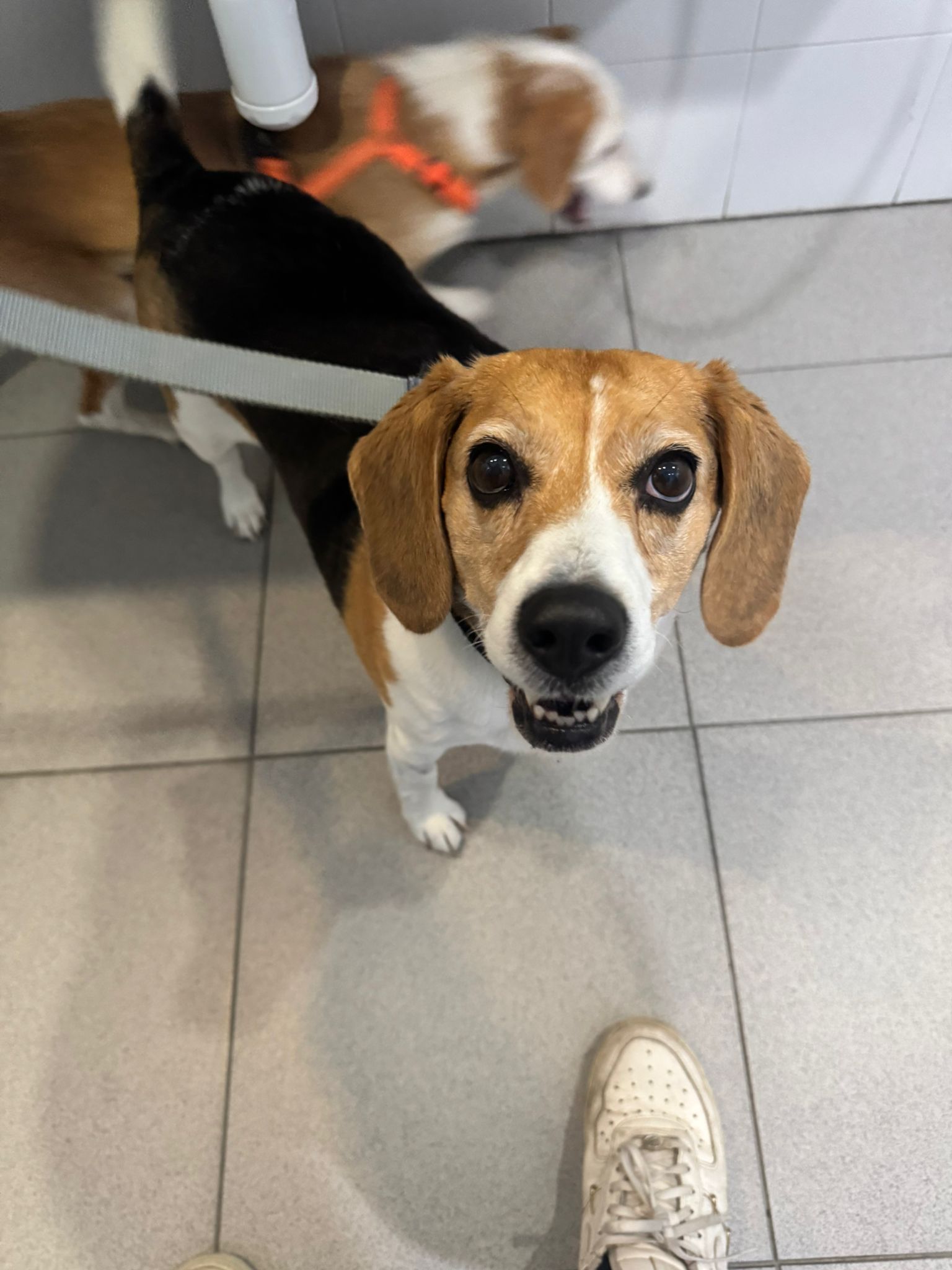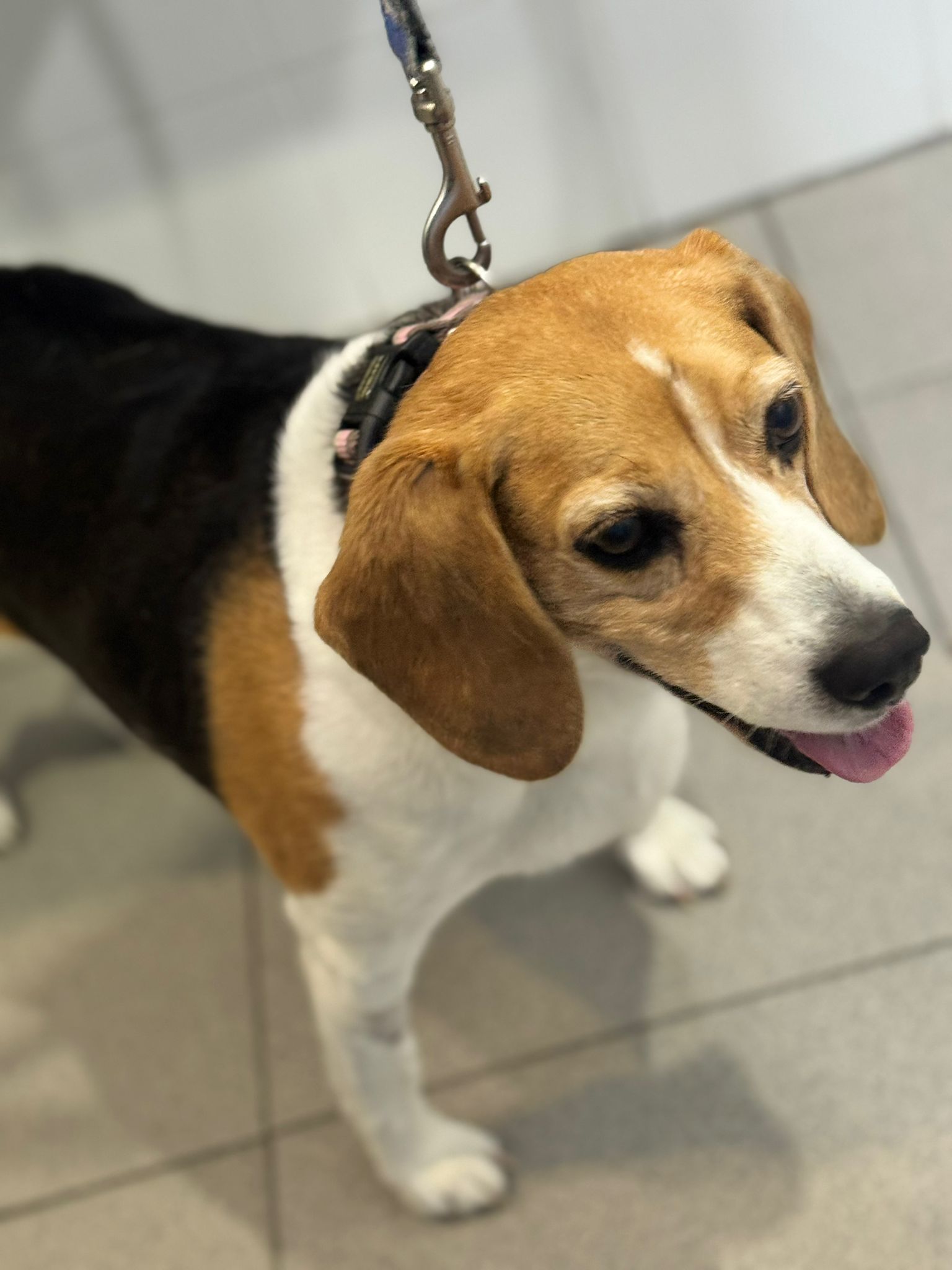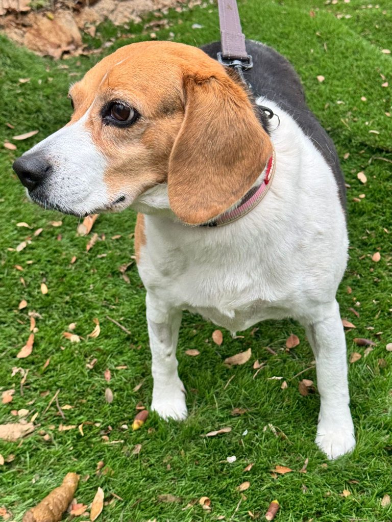 She has no health issues and is an absolute sweetheart—super, super cheerful, one of those dogs who never stop wagging their tail! She LOVES getting cuddles, attention, belly rubs, and affection.