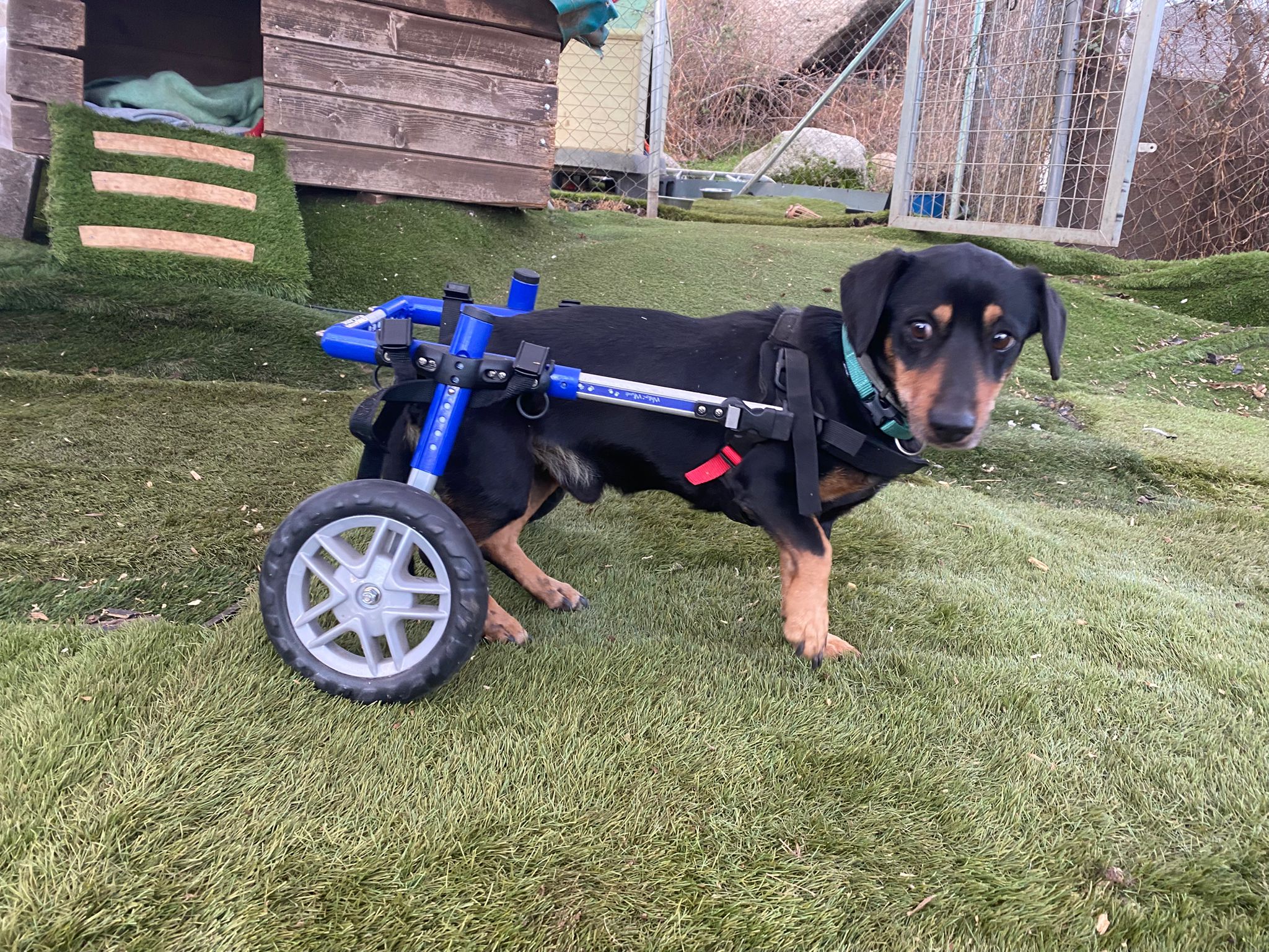 Este mix de teckel de 5 años vivía en una casa de campo con su familia. Hace dos semanas empezó de manera súbita a arrastrar sus patas traseras. Le llevaron al veterinario y allí, mediante la exploración física, sospecharon que tenía una lesión neurológica grave y aguda compatible con una hernia a nivel de columna tóraco-lumbar. Se les planteó realizar otras pruebas radiológicas para realizar un adecuado diagnóstico y poder realizar una cirugía precoz (porque en estos casos lo importante es operar cuanto antes); sin embargo, la familia lo rechazó por “motivos económicos”. Por lo que se inició tratamiento médico y se les pidió reevaluación a las 48 h. ODY no presentó ninguna mejoría neurológica y además se observó que no tenía un adecuado control de esfínteres; por lo que la familia no quiso seguir cuidándolo y quisieron eutanasiarlo. Fue en ese momento cuando la veterinaria decidió hacerse cargo del animal y contactó con Macu para traerlo a BICHOSRAROS. Acaba de llegar al Refugio y aquí empieza su nueva vida. ¡Vamos a darle todo el cariño y amor que se merece! ¡Además de que va a estrenar una silla de ruedas superchula que le hemos cogido para él! ¡Ya os iremos contando cómo va adaptándose!