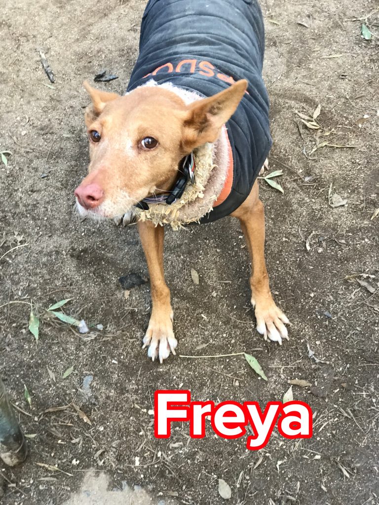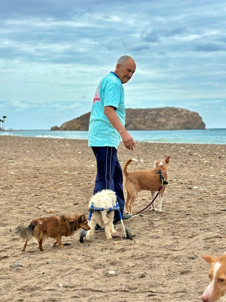 FREYA: Nuestra querida abuelita podenca de 12 años con una hernia discal que no fue operada en su momento; camina poco y con dificultad, pero no lo suficiente como para necesitar una silla de ruedas. Fue evaluada por nuestro equipo veterinario y está en tratamiento con medicamentos para controlar el dolor y facilitarle la marcha. Freya camina con cierta dificultad; se cae con frecuencia y no le gusta estar de pie durante mucho tiempo. La decisión de no usar una silla de ruedas siempre la toma el veterinario, ya que una silla de ruedas es un tratamiento ortopédico que siempre debe ser supervisado y prescrito por un especialista, ya que, incluso en el caso de hernias, puede ser perjudicial. Las sillas de ruedas están diseñadas para animales con movilidad reducida. Freya camina mal, pero camina. Si no pudiera caminar en absoluto, usaríamos una silla de ruedas para ayudarla a moverse durante cortos periodos. Pero ahora mismo, ¡el veterinario nos ha recomendado que no usemos una silla de ruedas para que pueda moverse con mayor facilidad y evitar el dolor!