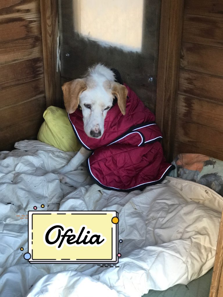 OFELIA: Nuestra abuelita de 14 años que llegó la semana pasada muy delgada y con infección por Leishmania. Poco a poco se va adaptando y es que no sabemos lo que habrá sufrido en el pasado esta pequeña; pero le cuesta tumbarse en las camitas y busca el suelo para dormir, come poco pero con ganas, ¡así que seguiremos poco a poco dándole cariño y amor para que vaya confiando en nosotros!