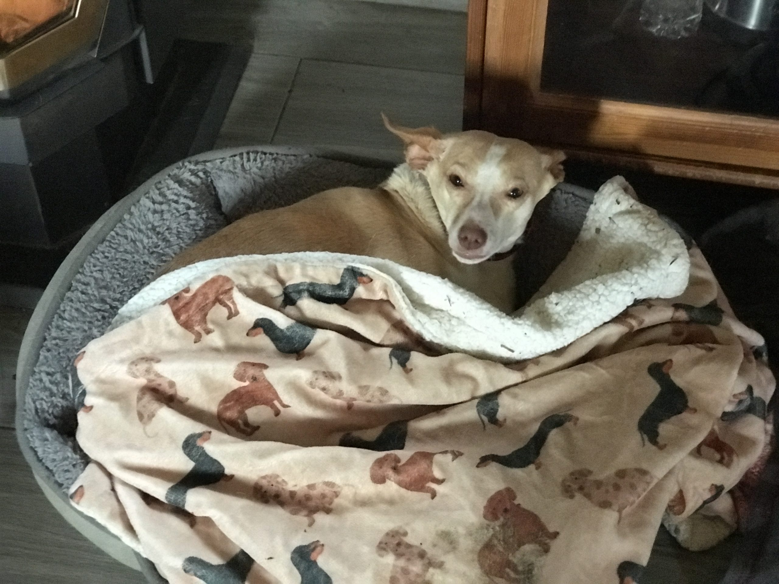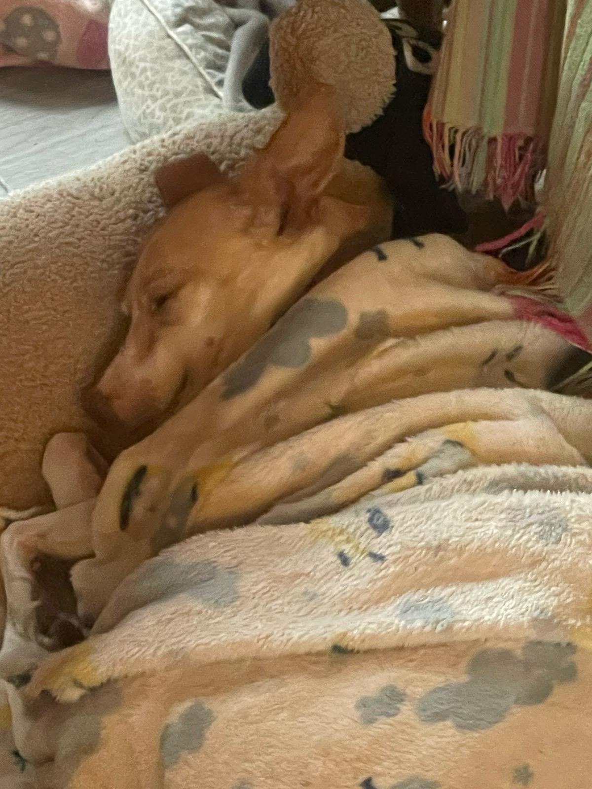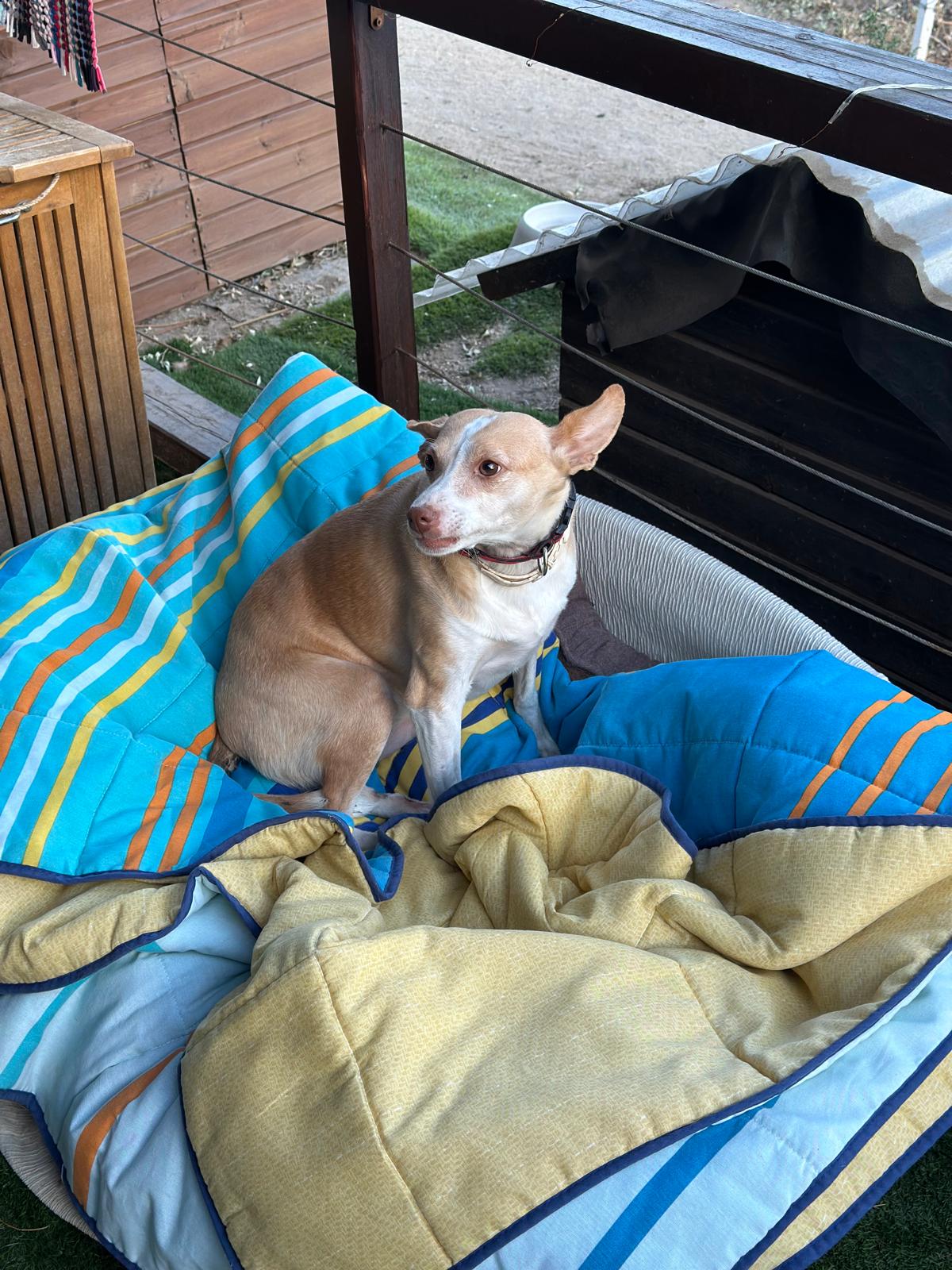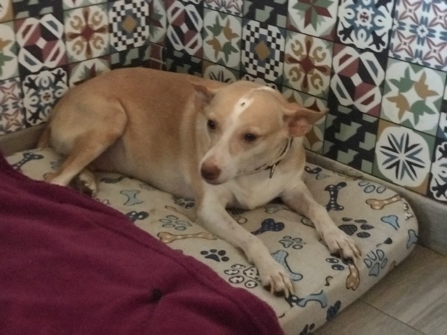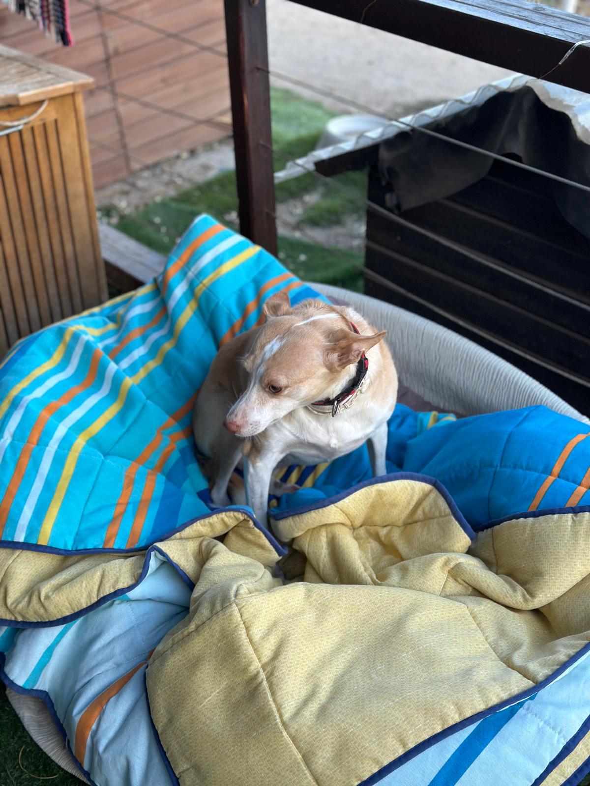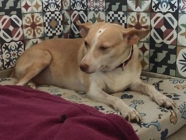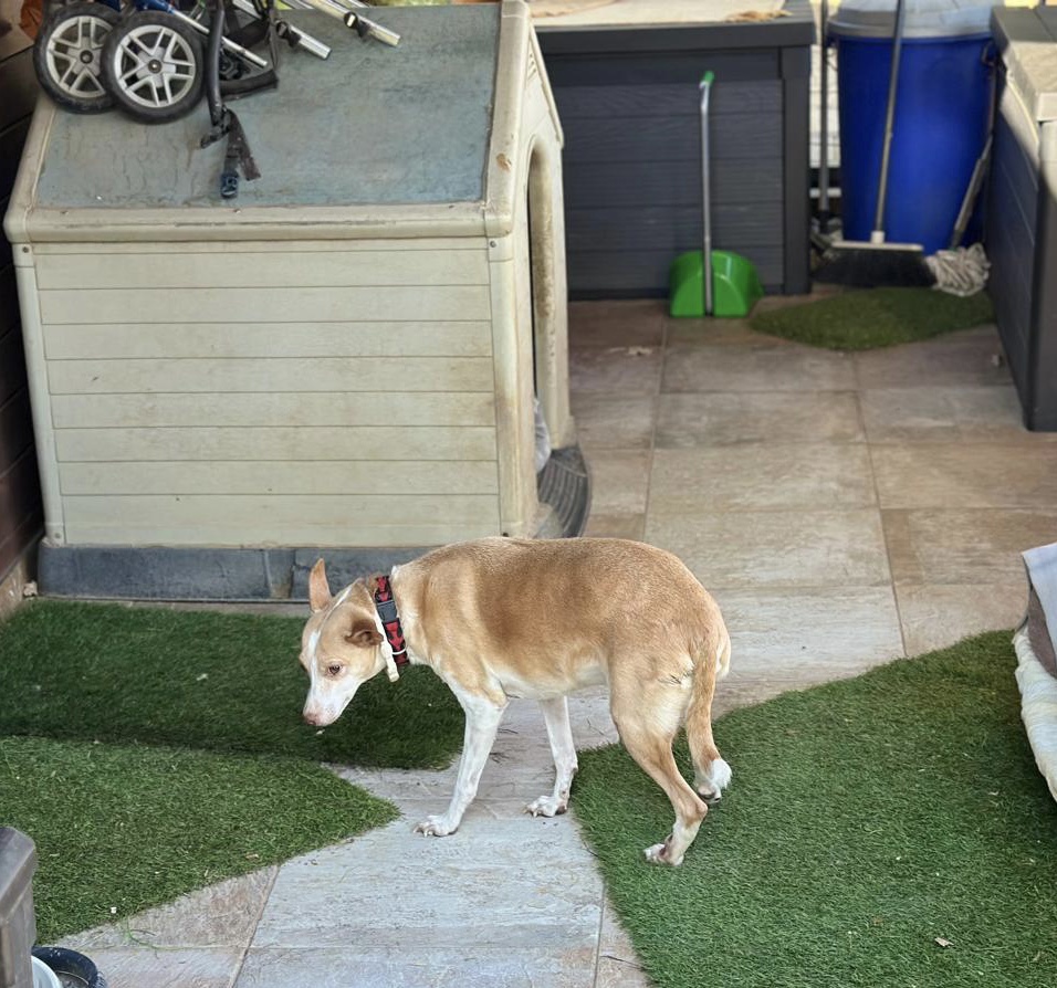 RITA apareció atropellada en un lateral de una carretera mientras diluviaba. La llevaron corriendo al veterinario y vieron que tenía una lesión medular inoperable. Se quedó parapléjica e incontinente. Como nadie quiso hacerse cargo de ella, María y Macu fueron a recogerla y se la trajeron a Bichosraros. Rita fue poco a poco mejorando y recuperó marcha espinal, por lo que camina sola y sin necesidad de silla de ruedas. Es incontinente, pero no le incapacita para ser feliz y disfrutar de la vida.